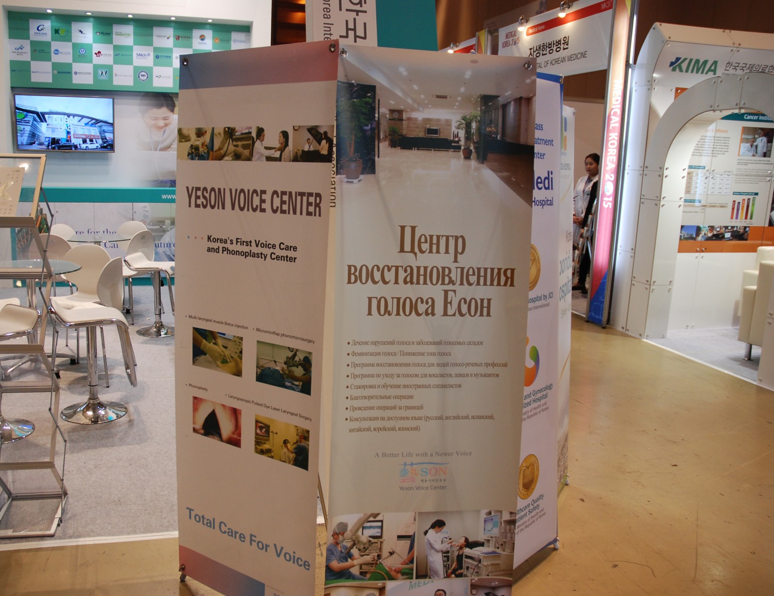 예송이비인후과 음성센터(이하, 예송음성센터)는 지난 8일부터 10일까지 총 3일간 코엑스(COEX)에서 진행된 ‘메디컬 코리아 2015 – 제 6회 글로벌 헬스케어 & 의료관광 컨퍼런스’(The 6TH Global Healthcare & Medical Tourism Conference)에 참여했습니다. 보건복지부가 주최하고 한국보건산업진흥원이 주관하는 이번 컨퍼런스는 해외환자 유치와 의료시스템 해외진출 분야의 최신 동향을 발표하고 토론하는 6개의 세션의 컨퍼런스, 국내 의료기관 및 유치업체와 해외 사업파트너를 사전에 연결한 비즈니스 미팅, 57개의 테마 별 홍보부스 운영, 해외환자 유치 활성화 관련 신규 일자리 창출 확대와 고용 증진을 위한 잡페어 등 다채로운 프로그램이 마련되어 진행됐습니다. ‘혁신적 글로벌 헬스케어 시대를 대비한 제2의 도약’이라는 슬로건 아래 실시된 이번 컨퍼런스에는 30여 개 나라의 정부 및 공공기관, 지자체, 의료기관, 해외환자 유치업체, 유관협회, 관련 기업 등 관계자 500여명이 참가했습니다 예송음성센터는 이비인후과로는 유일하게 참여했으며 예송음성센터의 목소리 치료로 특화된 프로그램에 많은 관심을 받았습니다.