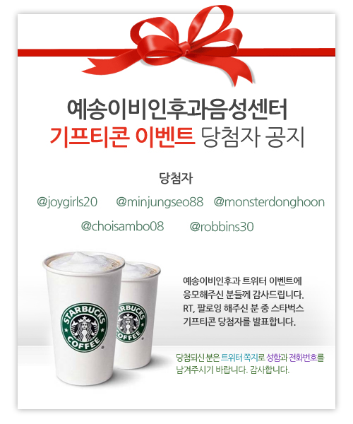 예송이비인후과 트위터 이벤트에 응모해주신 분들께 감사드립니다. RT, 팔로잉 해주신 분 중 스타벅스 기프티콘 당첨자를 발표합니다.