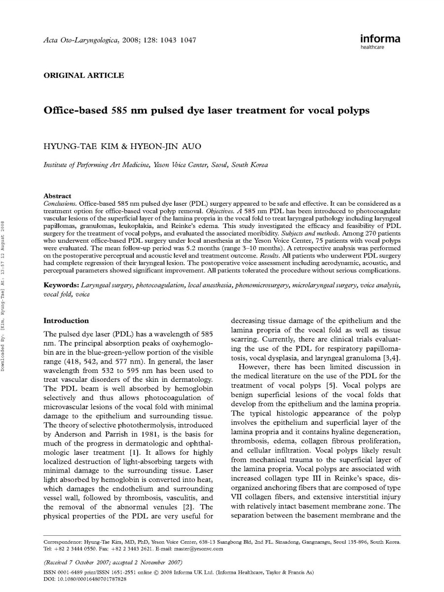 성대폴립의 새로운 치료방법인 PDL 성대수술의 유용성 연구논문 발표 - 최신연구활동