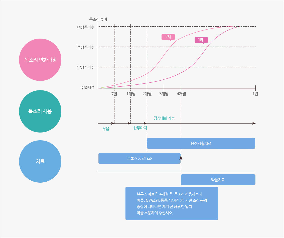 수술 후 1년정도까지 소요됩니다. 새로운 성대에 적응하기 위해서 음성재활훈련이 필요하며, 음성검사 (CVE) 검사에 따라 성대 떨림이 있는 경우 성대 떨림을 차단하여