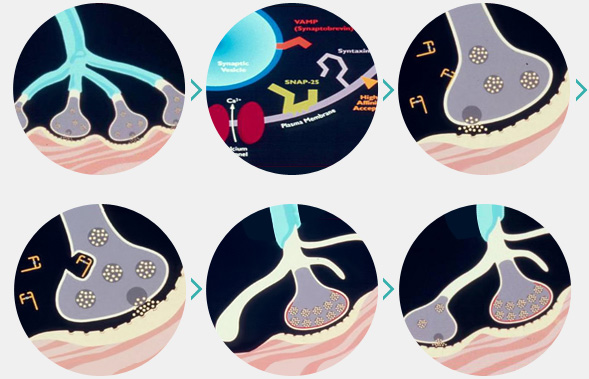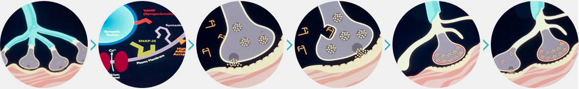이때 보툴리눔톡신은 신경말단 내부의 단백질인 SNAP-25를 절단하여 더이상 신경말단부위에서 아세틸콜린을 분비하지 못하도록 만듭니다.